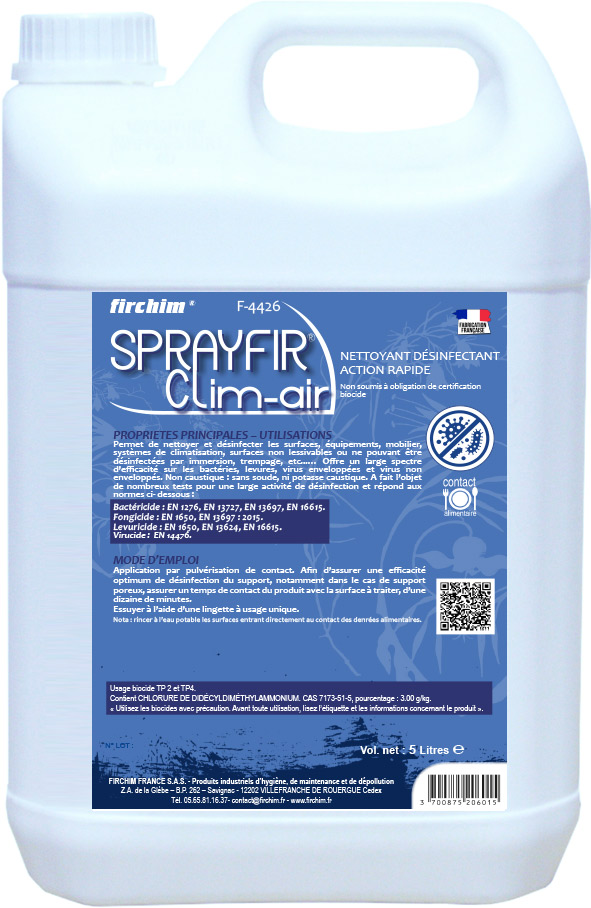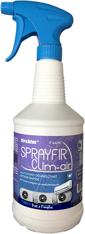 Bonjour, nouveau produit ajouté au catalogue : SPRAYFIR® CLIM-AIR (Spray 750 ml et bidon de 5 l). En pièce jointe le FLASH INFO descriptif et sa Fiche Technique. Il sera sur la prochaine version papier du catalogue. Il a d'ores et déjà été ajouté au site internet pour les demandes de devis.