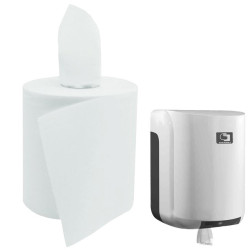 Bobine d’essuyage blanche gaufrée à dévidage central.
