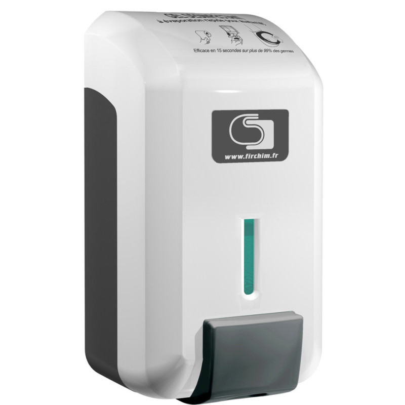 Distributeur de gel hydroalcoolique à poussoir avec réservoir amovible.