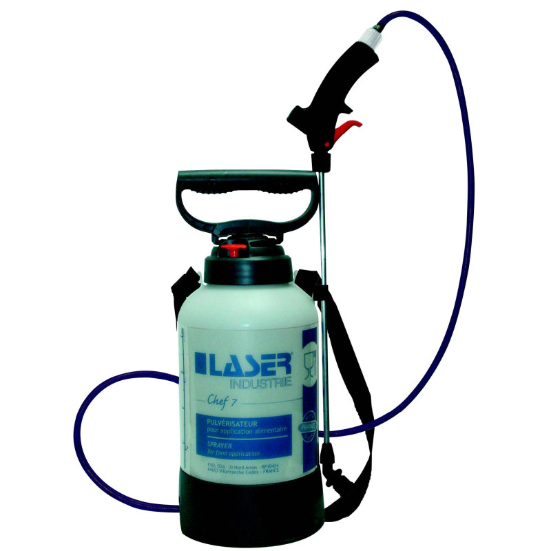 Réservoir translucide en polyéthylène soufflé et gradué. Pompe et poignée de lance équipées de joints Viton. Lance en aluminium 40 cm - 2 buses incluses (pinceau et cônique) - Soupape de sécurité tarée à 3 bars - Bretelles ajustables. Grande poignée de pompage pour une meilleure prise en main et permettant le rangement de la lance. Utilisation (entre 3°C et 60°C) : application de produits alimentaires (lait, saumure, sirop, huile, beurre fondu, colorant, oeuf, caramel, vinaigre, flore de surface).