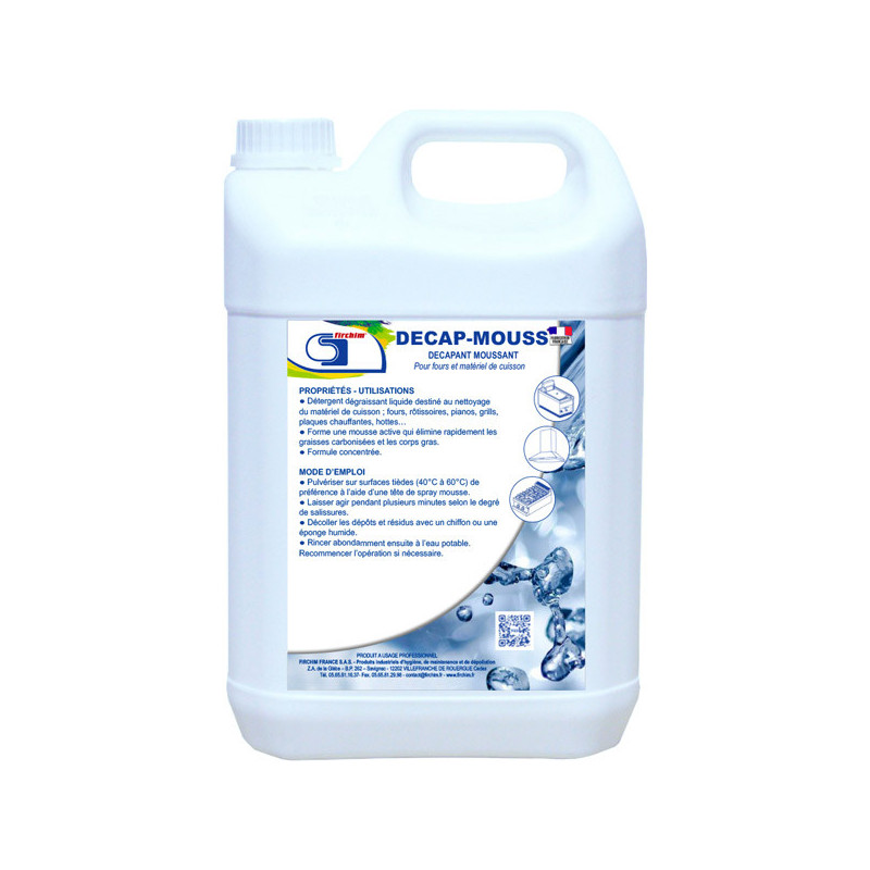 Produit une mousse caustique qui dégraisse et décape fours, plaques, grilles, pianos, friteuses, hottes... Elimine rapidement les graisses fraîches ou carbonisées. La diffusion sous forme de mousse permet une bonne adhérence aux parois. Pulvériser sur les surfaces tièdes, laisser agir quelques minutes. Enlever les dépôts solubilisés avec une éponge humide puis rincer à l’eau potable.