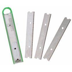 Poignée : plastique. Lames interchangeables en acier de 10 cm avec un côté affilé pour se débarrasser des autocollants, restes de peinture et un côté émoussé pour enlever plâtre, ciment, moquette…